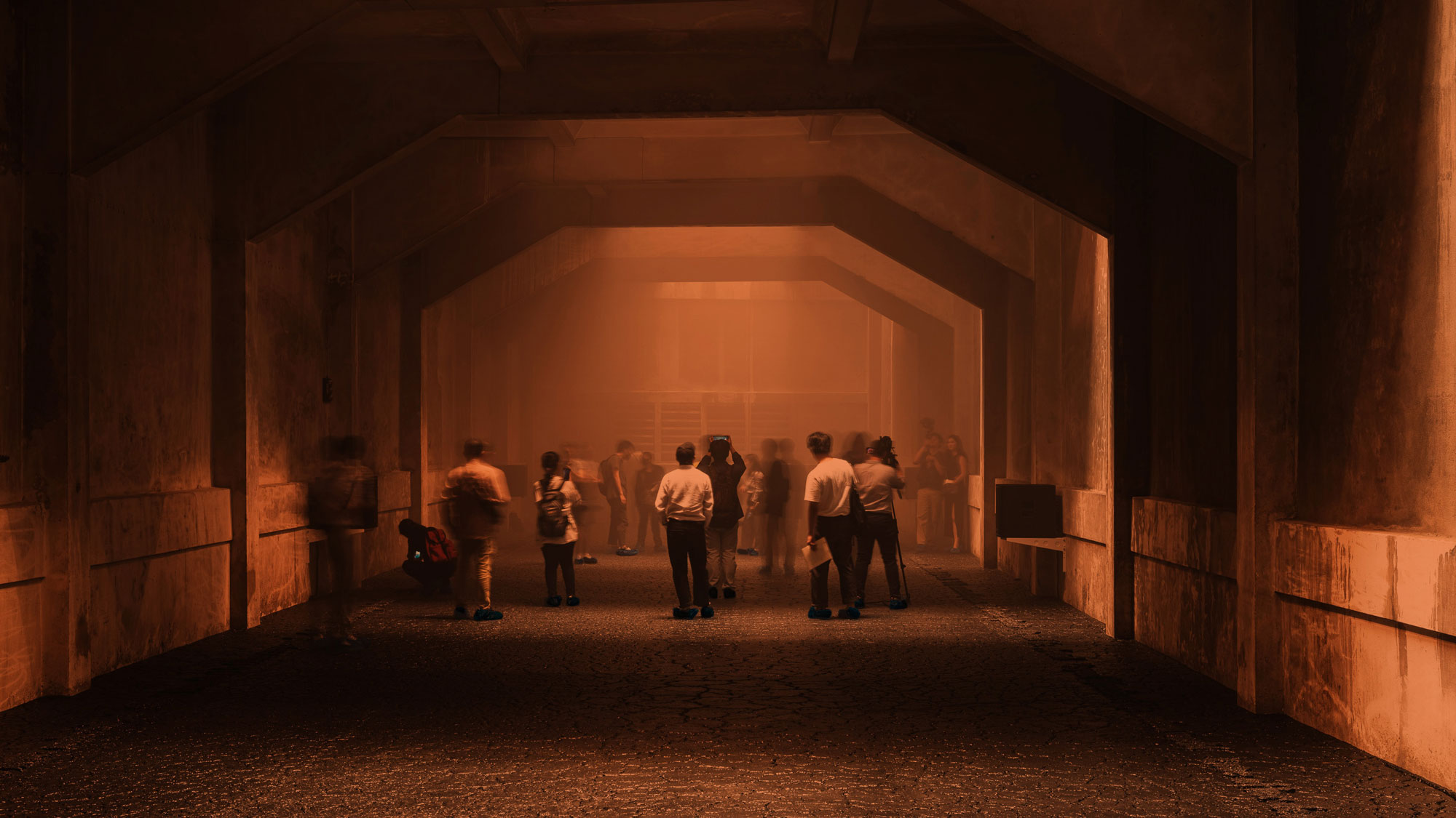 The screening scenario also includes performance collaborators that emerge from and disappear into patches of darkness. Towards and away from legible figures, the audience experiences the dissolution of traditional film into pure atmosphere.