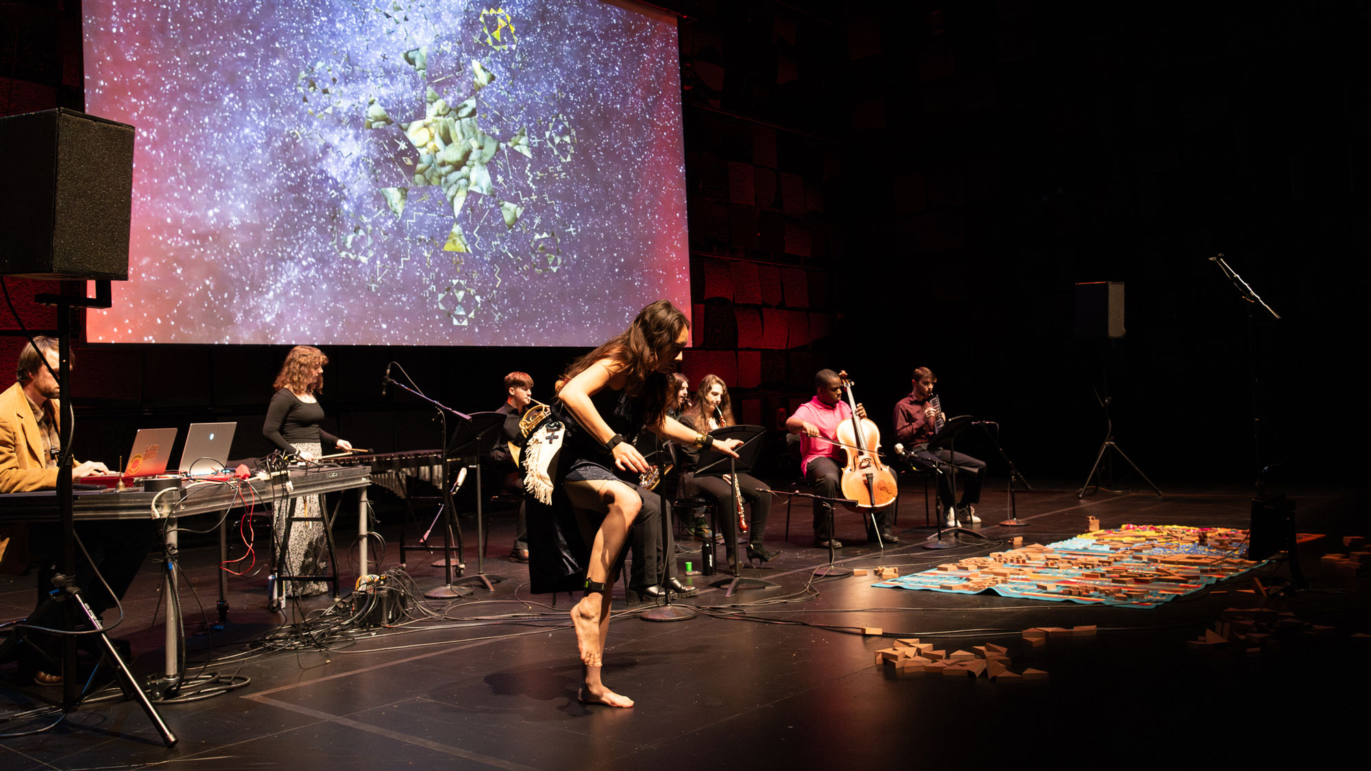 Wooden blocks in various shapes are stacked on top of bright floral blankets onstage at the Experimental Media and Performing Arts Center at Rensselaer (EMPAC) on the evening of Friday, Dec. 6; the triangles, staircases, and crosses are derived from the Lakota language. Performing artist, visual artist, and composer Kite (Suzanne Kite) gathers around the blocks with seven students, and together they arrange them into mosaic graphic scores born from stories that came to them in their dreams. Then, they take a seat and improvise their way through the paths they’ve created, bridging technology, visual art, and music into one.